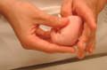 | 5.今度はねりきりあんをちぎります。ねりきりあんは、茜(あかね)色、黄色の2色に使います。 | 6. まず茜色から。赤と黄色をベースに色を白あんに混ぜます。微妙な色を出すためには感覚が大切。ちょっとでも赤が多すぎると、毒々しい色になってしまうのです! | 7.よくこねないと、まだらになってしまいます。でも手早い! | 8.時々、色を薄めるためにねりきりあんを足しながら、微妙な茜色に仕上げていきます |